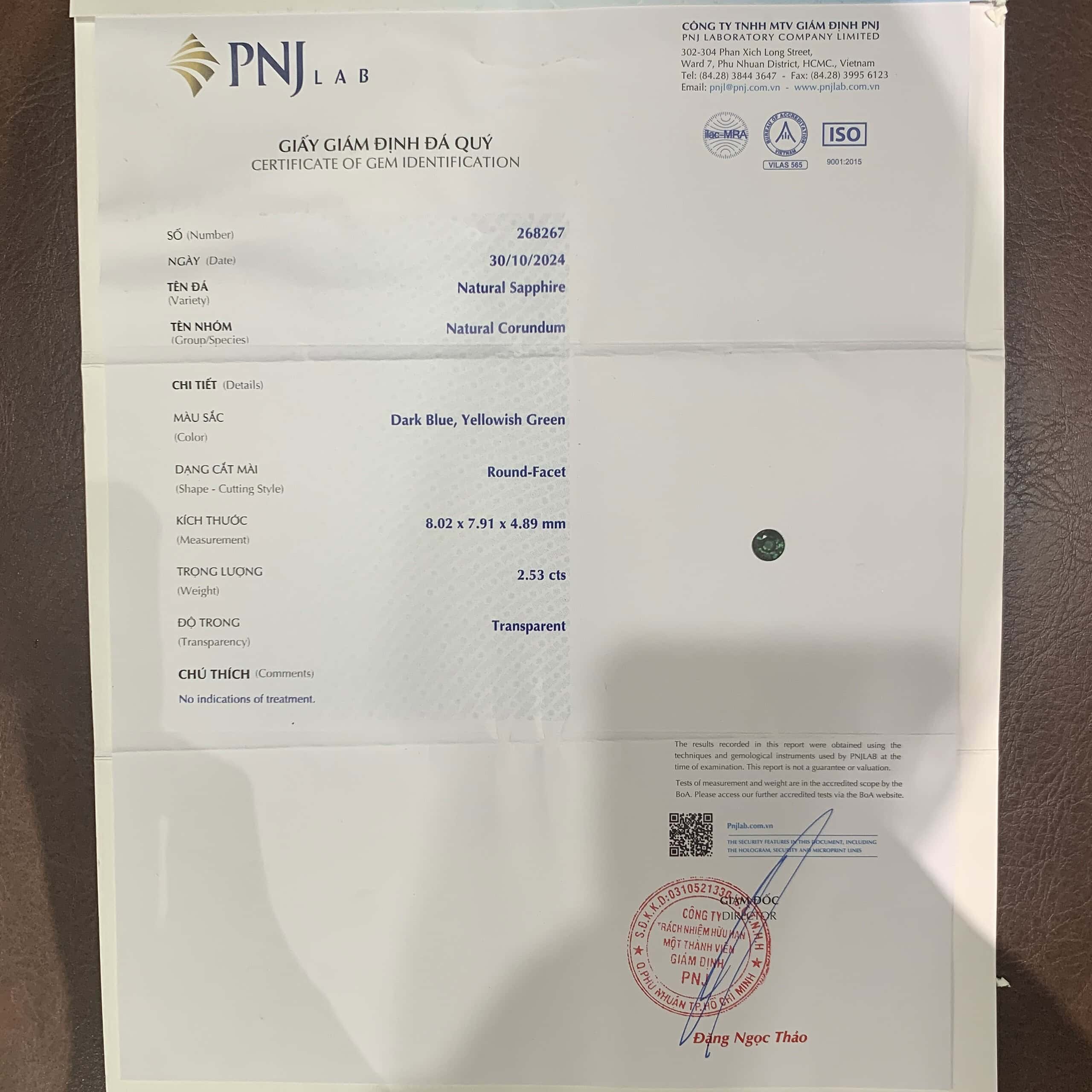 Viên Sapphire xanh lục có trọng lượng: 2,53ct và kích thước: 8,02 x 7,91 – 4,89mm. Giác cắt tiêu chuẩn khối round – facet, đủ đáy, độ chiếu đẹp, độ tinh khiết cao, tự nhiên 100%. Là một trong những viên đá quý tinh tế nổi bật với màu sắc xanh lục lấp lánh, được coi là biểu tượng của quyền lực và sự thanh cao. Sapphire xanh lục mang lại vẻ đẹp huyền bí, quyến rũ cho mọi thiết kế trang sức. Tìm hiểu thêm về đá Sapphire tại đây.