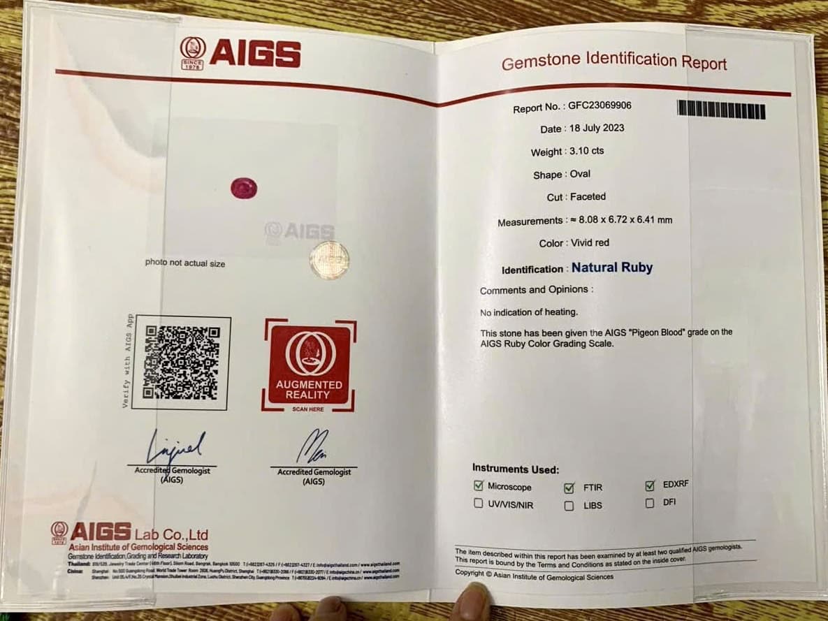 Thông tin cơ bản đá Ruby đỏ huyết Lục Yên chưa qua nhiệt tự nhiên 100% 3,08ct – IRRF251 2408308