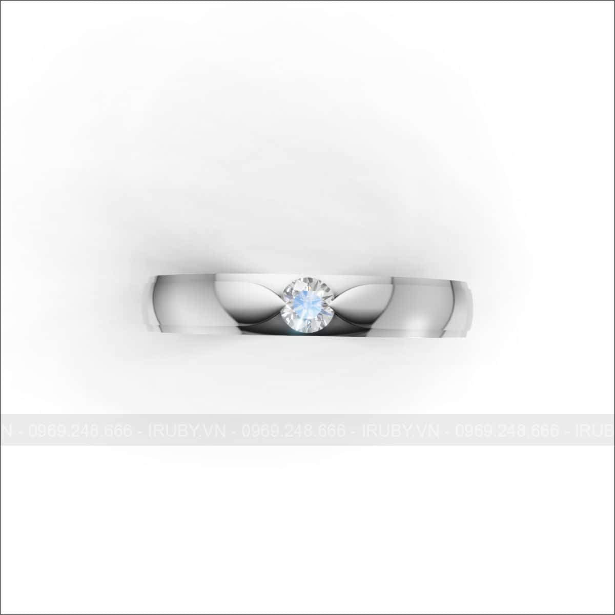 Viên kim cương chủ kích thước khoảng 2.8 – 3.1mm, đính chìm (bezel half-set) giúp bảo vệ viên đá tối ưu, hạn chế va chạm. Đồng thời tăng độ chắc chắn khi sử dụng lâu dài, đặc biệt phù hợp cho nhẫn cưới. Bản nhẫn rộng khoảng 3.0 – 3.5mm, form tròn ôm tay, tạo cảm giác vững chắc nhưng không thô. Trọng lượng kim loại ước tính từ 4.1 – 5.7g tùy chất liệu (vàng 10K, 14K, 18K hoặc bạch kim) và size tay thực tế. Thiết kế đồng điệu cho cả nam và nữ, khác biệt chỉ ở tỷ lệ kích thước để đảm bảo cân đối khi đeo. Mẫu nhẫn này không cầu kỳ về chi tiết, mà tập trung vào tỷ lệ chuẩn, độ hoàn thiện bề mặt và sự cân bằng ánh sáng.