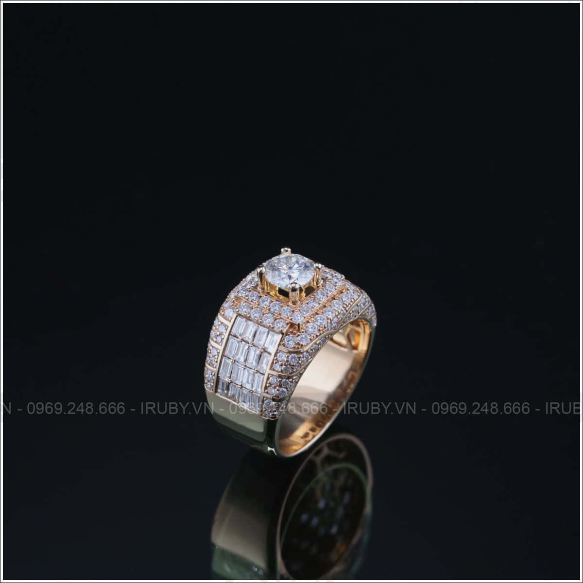 Mẫu nhẫn nam kim cương là biểu tượng của sự quyền uy và đẳng cấp, được chế tác từ chất liệu vàng 18K với trọng lượng vàng đạt 2.915 chỉ. Thiết kế gây ấn tượng mạnh bởi viên kim cương chủ 0.155 Carat, kết hợp cùng hệ thống 156 viên kim cương phụ (kích thước từ 1.0 – 1.6mm) và các viên đá chữ nhật (2.5×1.5mm) tinh xảo. Với tổng khối lượng đá quý lên tới 3.07 Carat, sản phẩm mang lại khả năng tán sắc rực rỡ và vẻ ngoài vô cùng hào nhoáng. Từng đường nét bản to mạnh mẽ được hoàn thiện tỉ mỉ, giúp tôn vinh phong thái lịch lãm và vị thế của người sở hữu. Đây không chỉ là một món trang sức cao cấp mà còn là tuyên ngôn về gu thẩm mỹ tinh tế và đẳng cấp vượt trội của phái mạnh.
