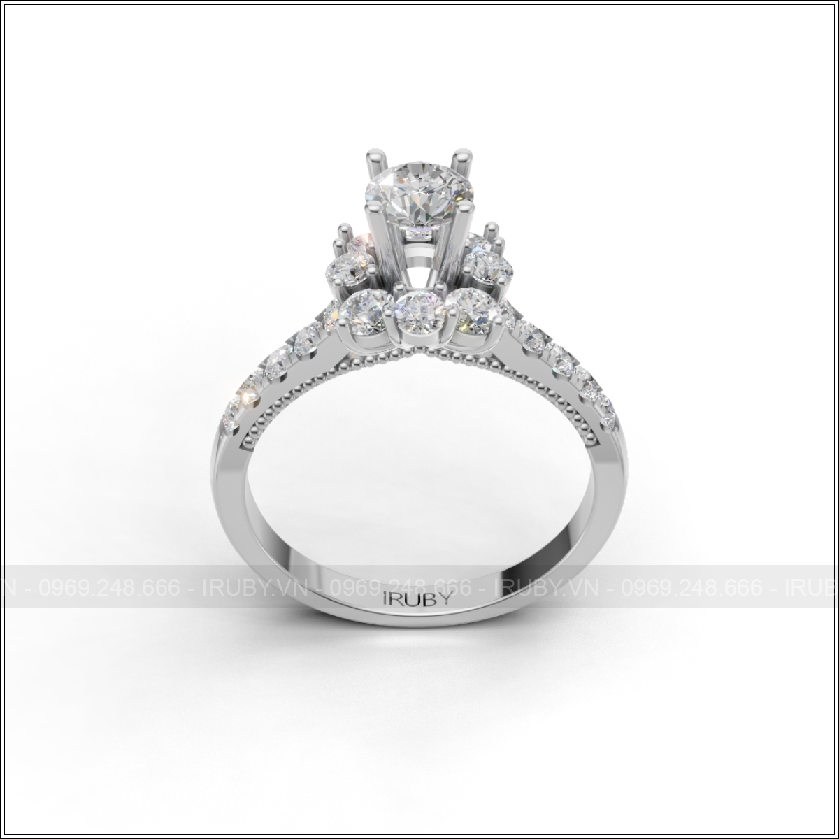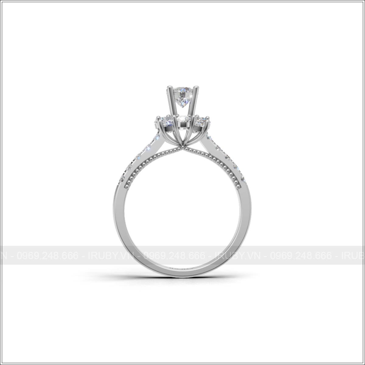Phần thân nhẫn đính kim cương nửa vòng, kết hợp viền bi milgrain tinh xảo ở cạnh dưới sang trọng và đẳng cấp. Thiết kế ôm tay, thanh thoát nhưng vẫn đảm bảo độ chắc chắn khi đeo hằng ngày. Viên kim cương chủ có thể tùy chọn kích thước phổ biến hoặc lớn hơn theo yêu cầu.