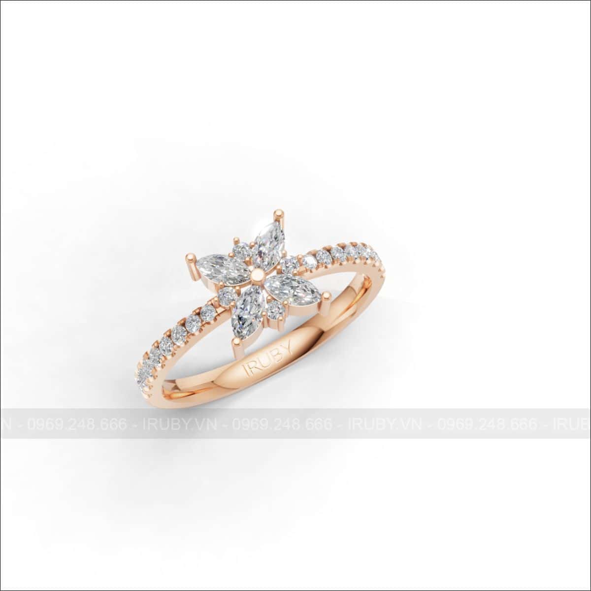 Nhẫn nữ kim cương Marquise thiết kế hình hoa 4 cánh độc đáo với 4 viên kim cương marquise 4x2mm. Xếp thành bông hoa lấp lánh, tạo điểm nhấn thanh lịch và khác biệt. Thân nhẫn pavé đính tổng cộng 20 viên kim cương tấm đa kích thước 1.1mm đến 1.5mm chạy dọc hai bên. Thiết kế mỏng nhẹ, tinh tế khi nhìn nhìn dọc trông như chiếc nơ xinh đẹp hoàn hảo để đeo hàng ngày hoặc xếp chồng cùng các nhẫn khác. Món trang sức lý tưởng dành tặng cho những cô nàng yêu thích sự nữ tính và độc đáo. Có sẵn 3 phiên bản: vàng 10K (0,4 chỉ), vàng 14K (0,44 chỉ) và vàng 18K (0,52 chỉ), cùng hai tông màu vàng trắng và vàng hồng sang trọng.