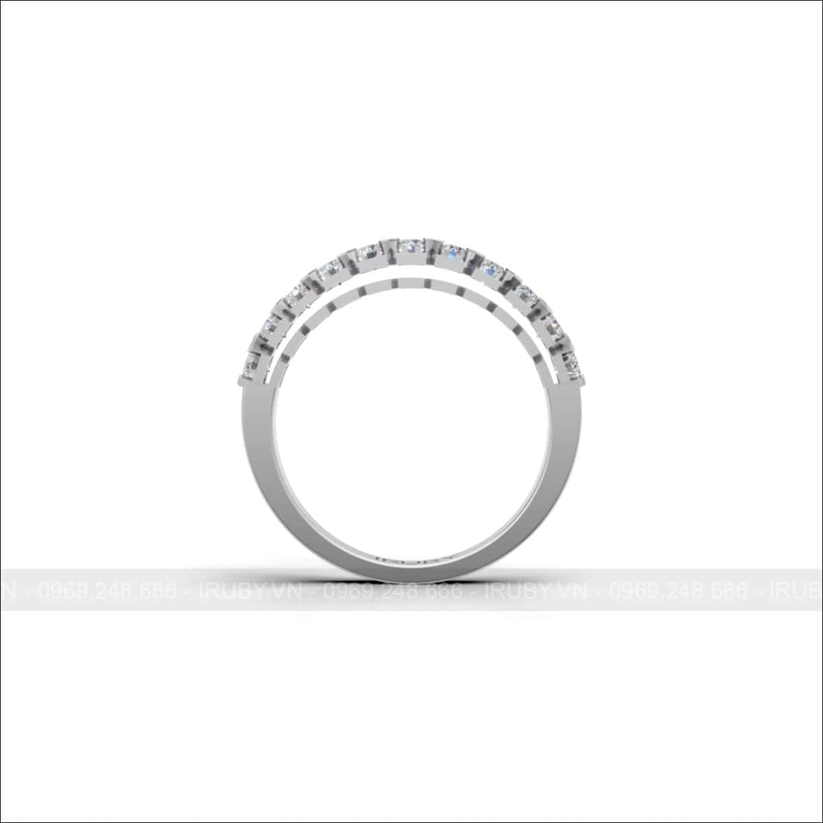 Các viên đá được tuyển chọn đồng đều về kích thước và độ chiếu, sắp xếp theo bố cục chuẩn xác, đảm bảo sự cân đối và hài hòa cho tổng thể. Kiểu đính chắc chắn giúp nhẫn giữ được độ bền khi sử dụng hằng ngày, đồng thời mang lại cảm giác đeo thoải mái, gọn gàng và dễ phối cùng nhiều phong cách trang phục khác nhau.